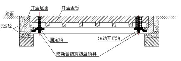 五、由于井蓋和蓋板均加有防盜鎖具,防盜鎖具的開啟、閉合,均由鎖舌轉動實現。故在安裝底座時,要在鎖舌轉動的位置預留出100×50×35(高)的空間,便于防盜鎖具的開啟、閉合,鎖舌靈活轉動。